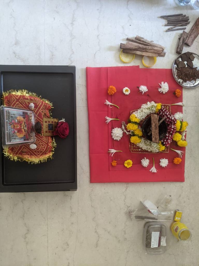 Last but not the least, the image, idol or murti of the diety. Goddess can be placed at the sacred space. This is not a compulsion. Deity worship is a matter of preference and connection.