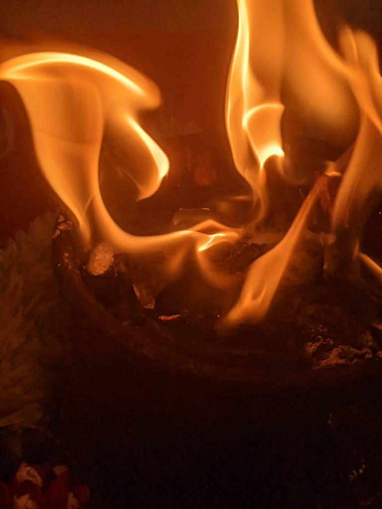 Sometimes Ghee, butter or fragrant oil is used to stoke the fire.